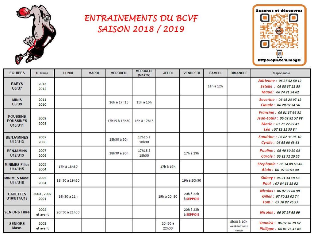Seniors filles : Année de naissance 2002 et avant, les lundis de 20h à 22h00 et les vendredis de 20h00 à 21h30